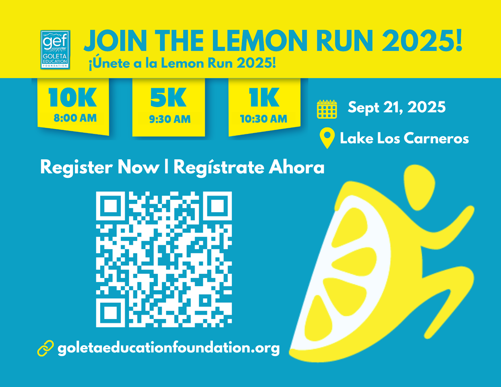 Lace up your running shoes and join the Goleta Education Foundation (GEF) for a very special 10th Annual Lemon Run on Sunday, September 21, 2025, at Lake Los Carneros! This beloved community event is back, bigger and better than ever, to celebrate ten years of running to advance elementary education in the Goodland.