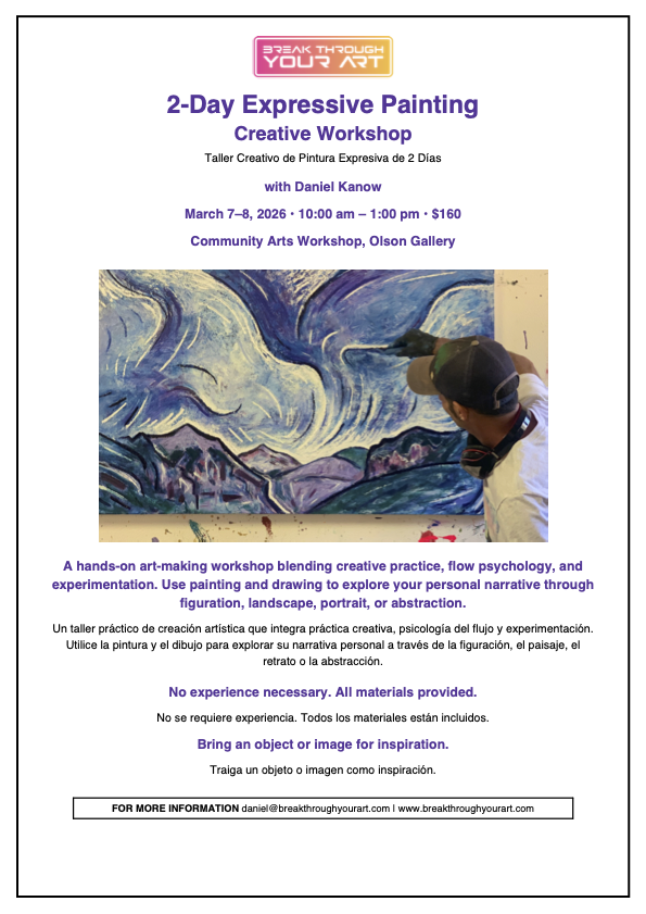 A hands-on art-making workshop blending creative practice, flow psychology, and experimentation. Use painting and drawing to explore your personal narrative through figuration, landscape, portrait, or abstraction.