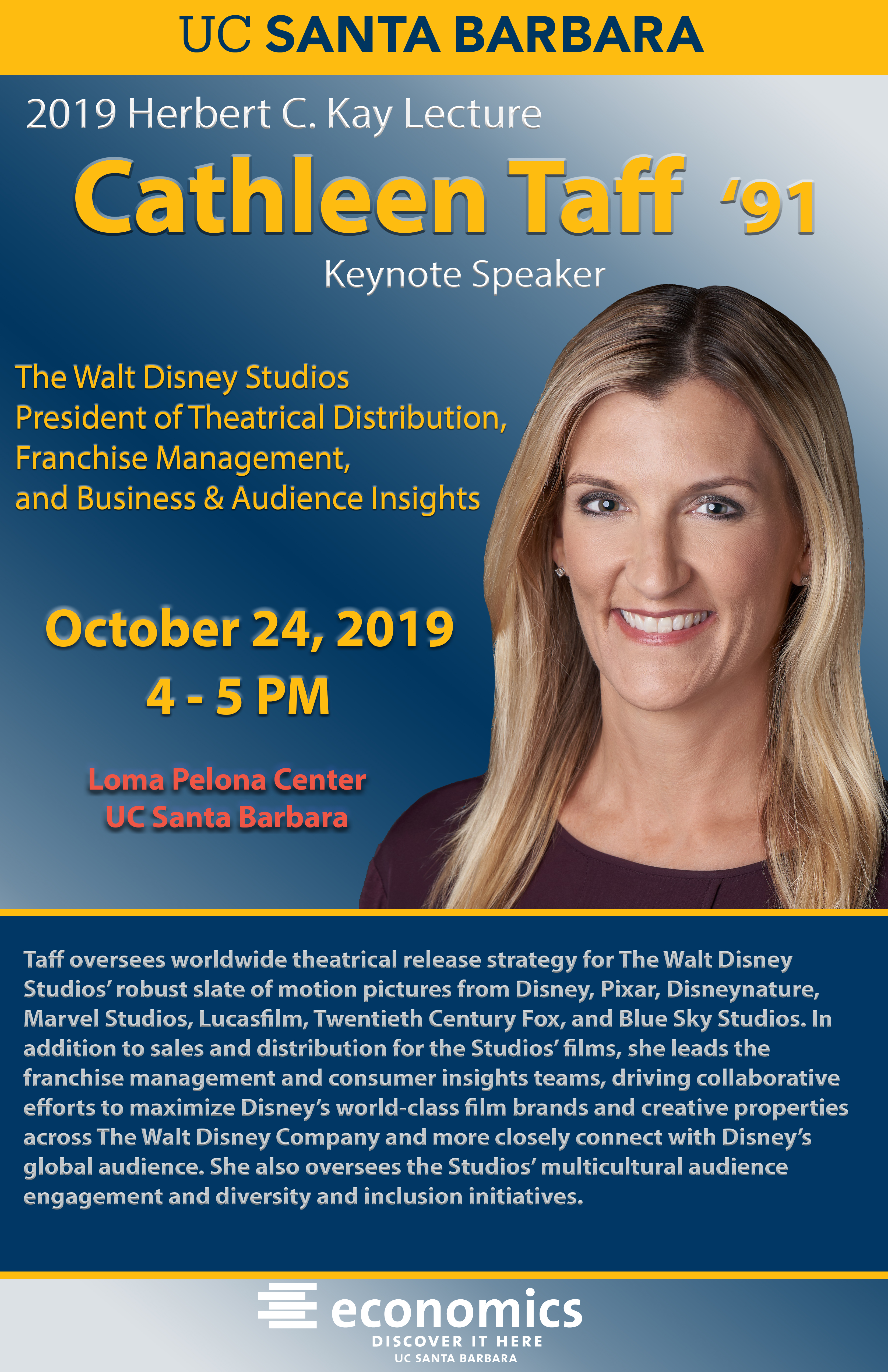 UCSB’s Department of Economics welcomes Cathleen Taff of The Walt Disney Studios to be the speaker for the 2019 Herbert C. Kay Undergraduate Lecture.