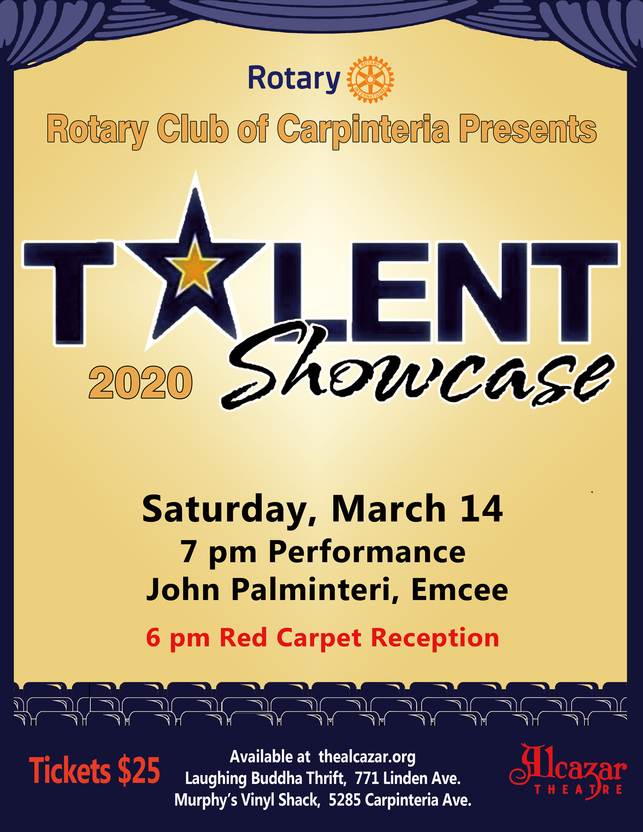 The Rotary Club of Carpinteria will present its 11th Annual Talent Showcase on Saturday, March 14 at 7 p.m. at the Alcazar Theatre. There will be a red carpet reception to kick off the evening at 6 p.m. General admission tickets are $25 per person and are available online at thealcazar.org, or at Laughing Buddha Thrift and Murphy’s Vinyl Shack in Carpinteria. You can also purchase tickets through local Rotary members. Last year’s tickets sold out one week before the show, so be sure to get yours while you can!