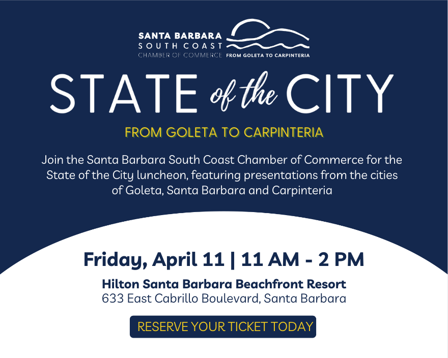 State of the City – From Goleta to Carpinteria on Friday, April 11, at 11 AM, hosted at the stunning Hilton Santa Barbara Beachfront Resort. This event offers an exclusive opportunity to hear directly from leaders across all three cities, united under one roof. Gain valuable insights into the future of our community, key developments, and exciting initiatives shaping the region. Don’t miss your chance to be part of this important gathering!