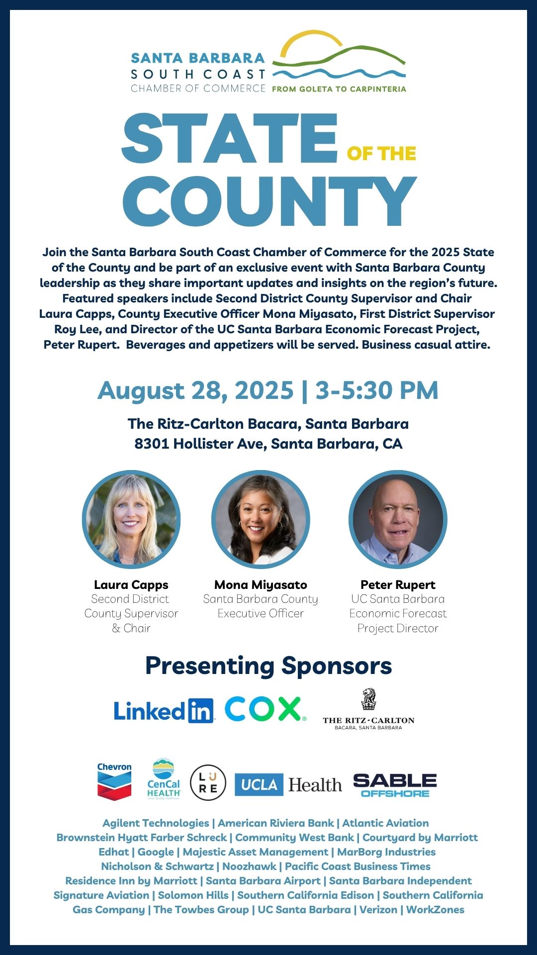 Join the Santa Barbara South Coast Chamber of Commerce for the 2025 State of the County and be part of an exclusive event with Santa Barbara County leadership as they share important updates and insights on the region’s future.
