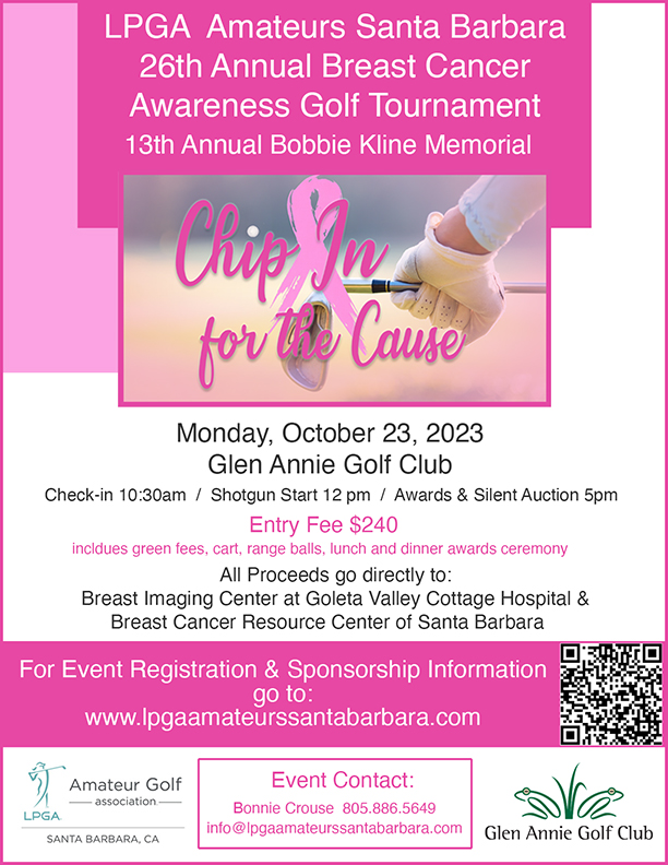 The 26th Anniversary of the Annual Breast Cancer Awareness Golf Tournament will be held on October 23, 2023 at Glen Annie Golf Club, 405 Glen Annie Road, Goleta, CA. Participating in this tournament provides the opportunity to help raise funds for two of our community organizations, the Breast Imaging Center at Goleta Valley Cottage Hospital and the Breast Cancer Resource Center of Santa Barbara. For years, these local centers have been providing valuable services to those being treated for, and recovering from, breast cancer. This year’s fundraising goal is $50,000.00.