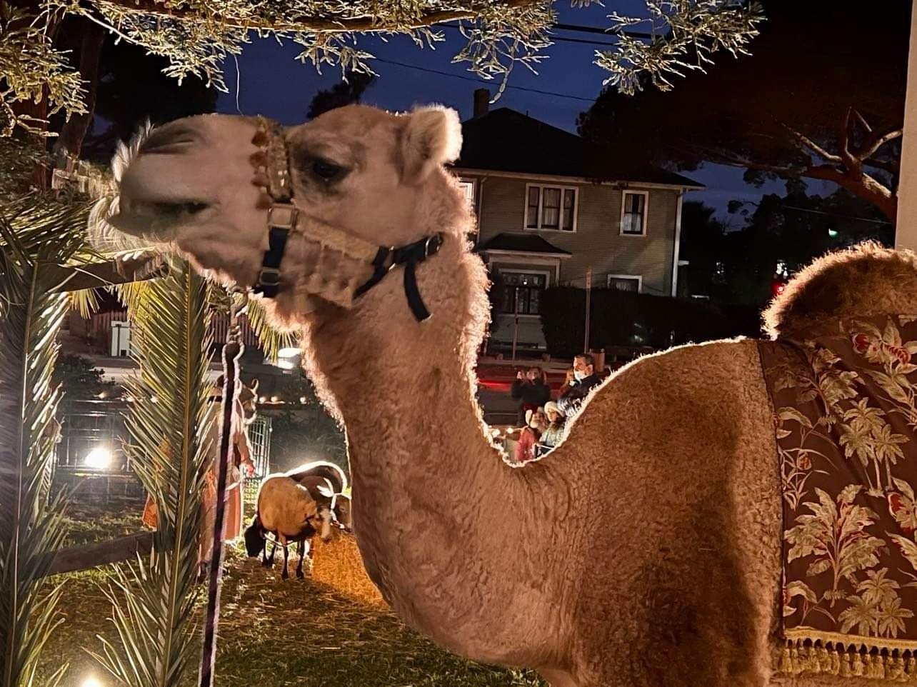 Under the shelter of a towering Coast Redwood tree and within a rustic stable, costumed volunteers portraying Mary, Joseph and the Baby Jesus are accompanied by the Three Kings, angels and shepherds. Majestic live camels, a beloved feature since the inception of Living Nativity in 1990, have been joined in recent years by a petting zoo of small farm animals.