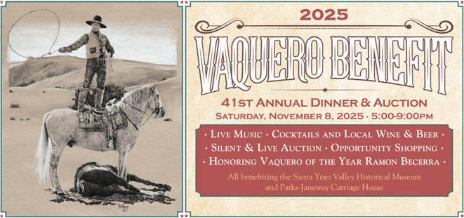 The Santa Ynez Valley Historical Museum’s 41st Annual Vaquero Benefit Dinner & Auction is Saturday, November 8 from 5:00 p.m. to 9:00 p.m.