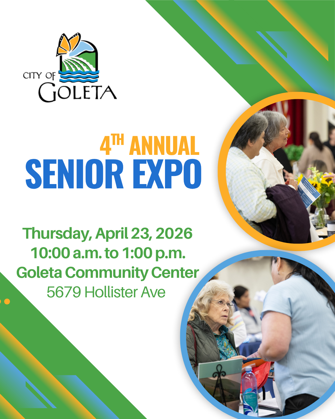 The City of Goleta invites the community to attend its 4th Annual Senior Expo on Thursday, April 23rd from 10:00 a.m. to 1:00 p.m. at the Goleta Community Center (5679 Hollister Avenue).