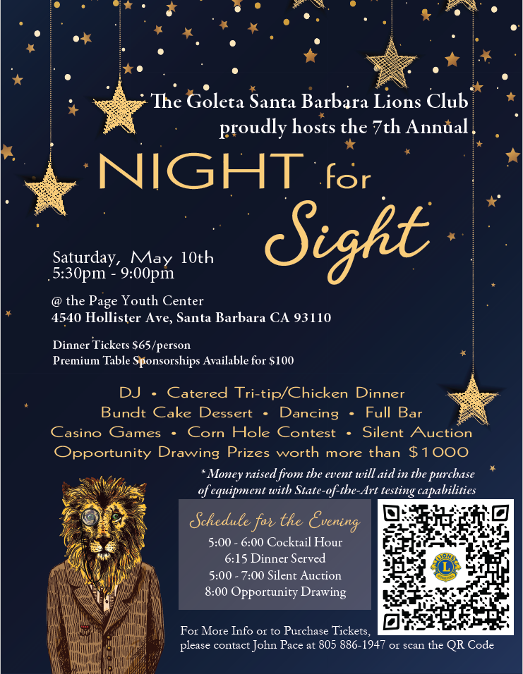 The 7th Annual Night for Sight is almost here! Join the Greater Goleta Santa Barbara Lions Club on Saturday May 10th, from 5 pm -9 pm at the Page Youth Center (4540 Hollister Ave).
