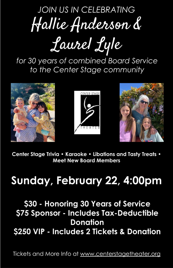 Join us on February 22 as Center Stage honors Hallie Anderson and Laurel Lyle for their combined 30 years of board service.