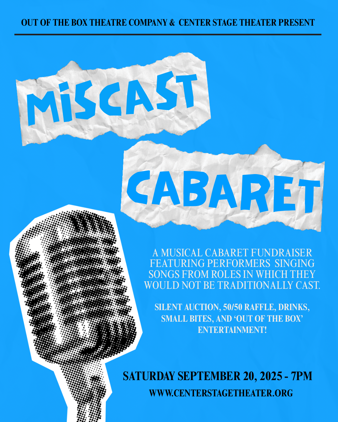 A joint fundraiser between Center Stage Theater and Out of the Box Theatre Company, The MisCast Cabaret will celebrate fifteen years of musicals that Out of the Box has performed on the CST stage! Featuring local performers, special guests, unique auction prizes, cocktails, and concessions treats.