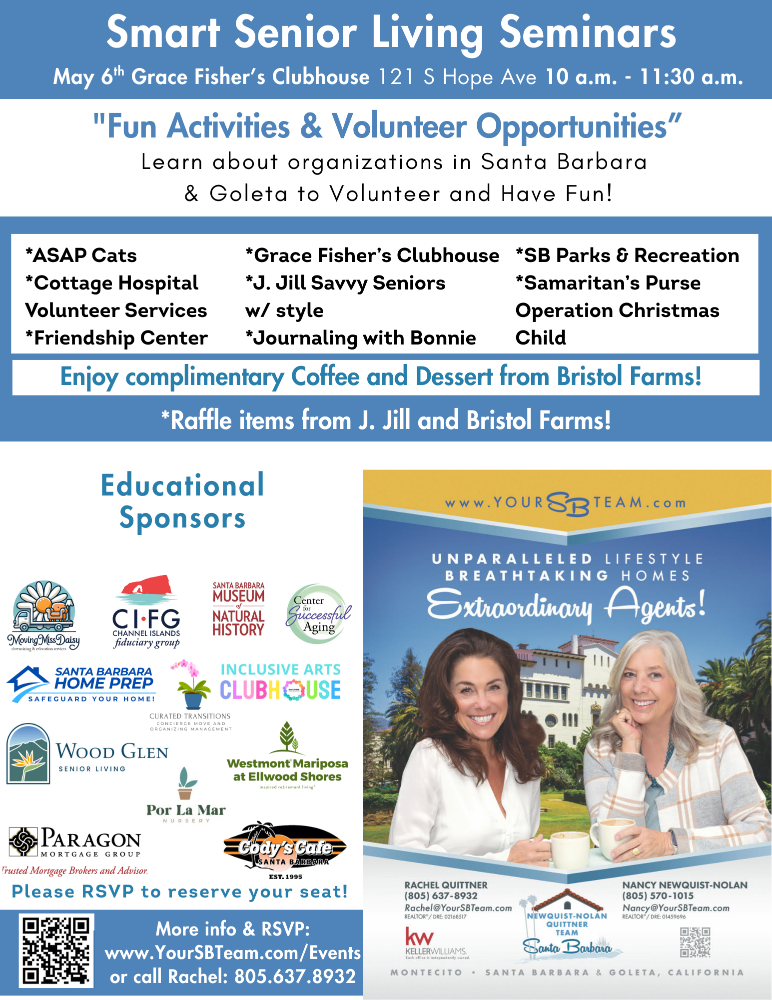 Join Nancy Newquist Nolan and Rachel Quittner of Your SB Team to learn about various organizations in Santa Barbara & Goleta to Join, Volunteer and Have Fun!