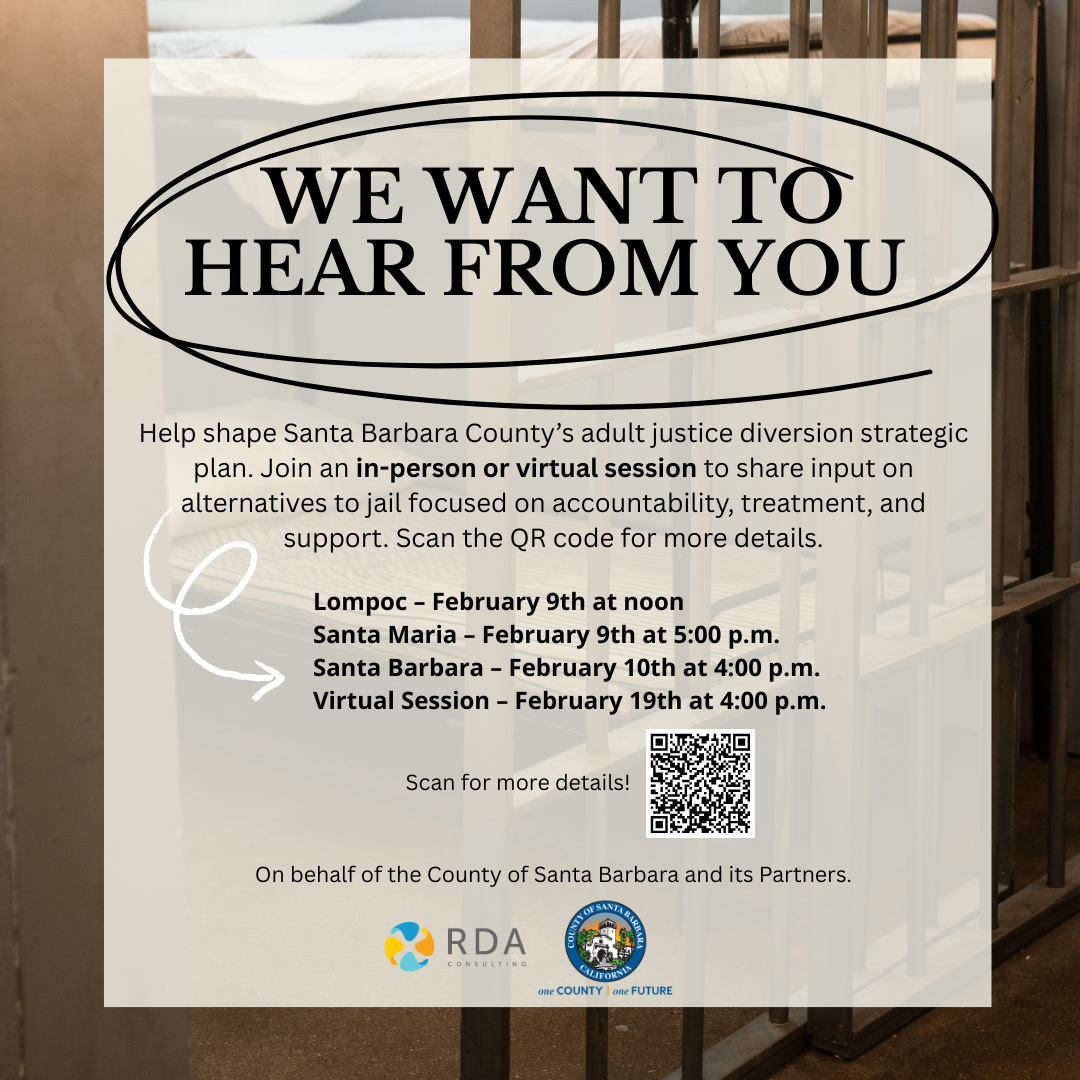 The County of Santa Barbara invites community members to participate in the continued development of its Adult Justice Diversion Strategic Plan. Informed by feedback gathered during community forums held in October 2025, the draft plan focuses on building a coordinated, countywide diversion system that expands alternatives to incarceration while supporting accountability, treatment, and access to services.