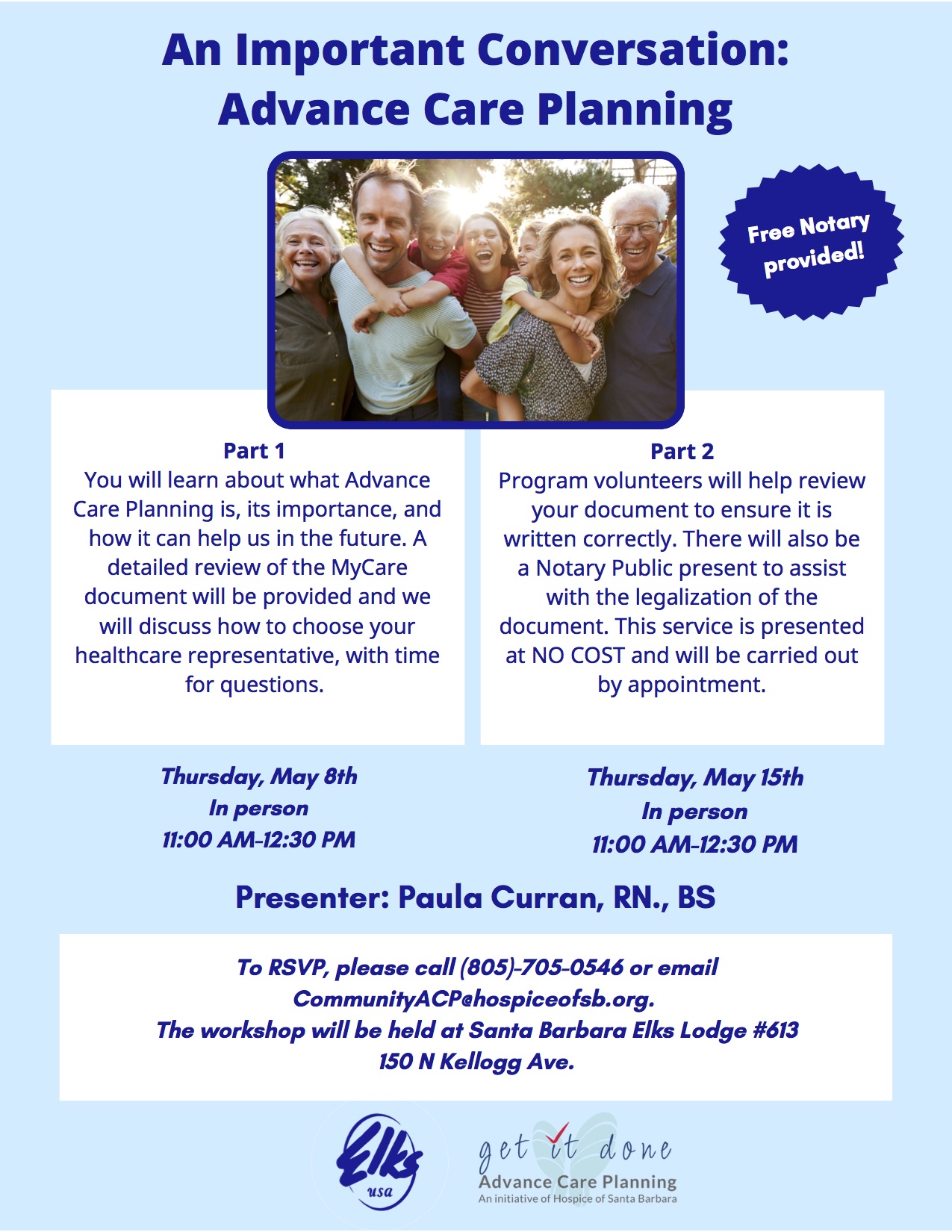 To RSVP, for your space at the Workshops, please call 805-705-0546 or email CommunityACP@hospiceofsb.org