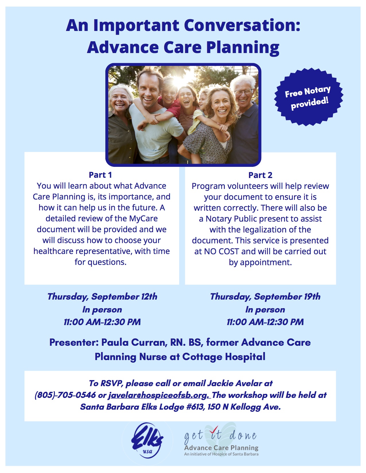 Two valuable Advance Care Planning Workshops. Presenter Paula Curran, RN. BS, former Advance Care Planning Nurse at Santa Barbara Cottage Hospital
