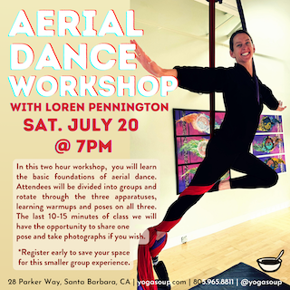 Join Loren for a two hour workshop where we will learn the basic foundations of aerial dance. Class will begin with a 30 minute stretch, followed by a 15 minute full body warmup. Attendees will be divided into groups and rotate through the three apparatuses, learning warmups and poses on all three. The last 10-15 minutes of class we will have the opportunity to share one pose and take photographs if you wish. Attendees need to bring water, wear leggings and a tight fitted top that covers the body.