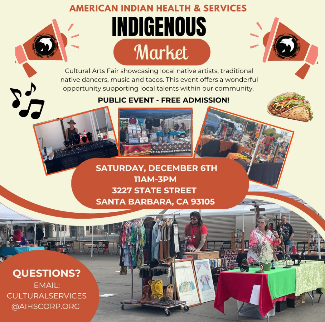 American Indian Health & Services is hosting an Indigenous Market on Saturday, December 6th from 11-3pm. The market will feature talented Native and Indigenous vendors sharing handmade art, jewelry, crafts, and so much more!