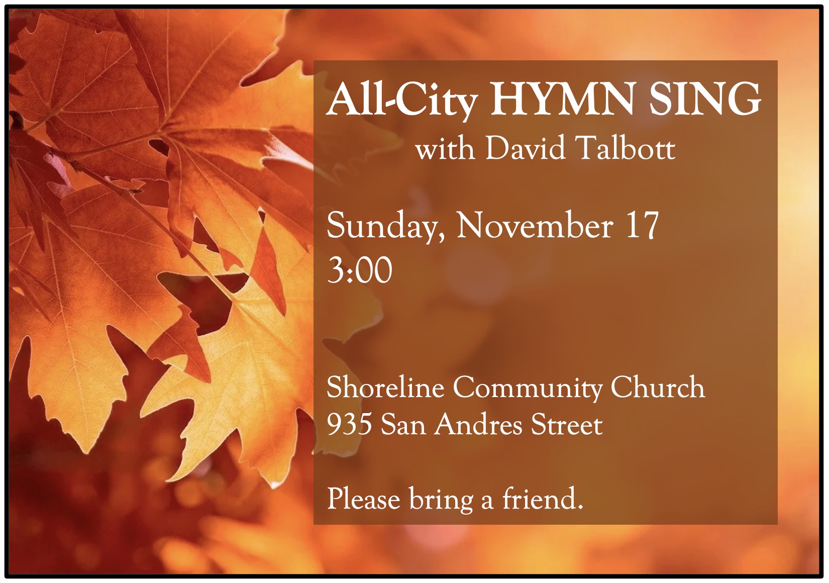 Please join us for another All-City HYMN SING. Pianist David Talbott will lead our hour-long singing of the great hymns of the faith, with his signature audience choice selections. Talbott was the resident musician at the Mount Hermon Christian Conference Center for 40 years, and was previously organist and pianist at Montecito Covenant Church. He is now guest organist at El Montecito Presbyterian Church, and lives at The Samarkand. Join us for a great hour of singing together.