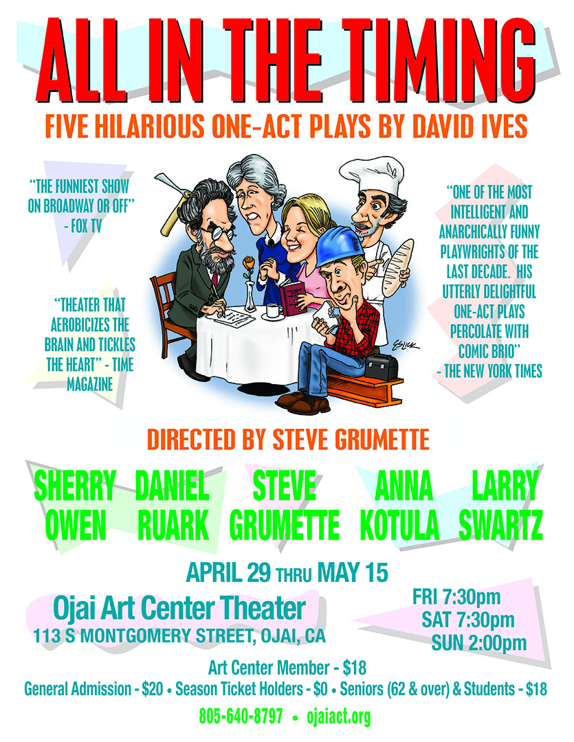 What do you get when you cross five gifted actors with fifteen roles, and a ton of surreal humor? Find the answer at the Ojai Art Center Theater starting next week. “All In the Timing,” an award-winning collection of one-act comedic plays by American playwright David Ives, runs April 29 through May 15.