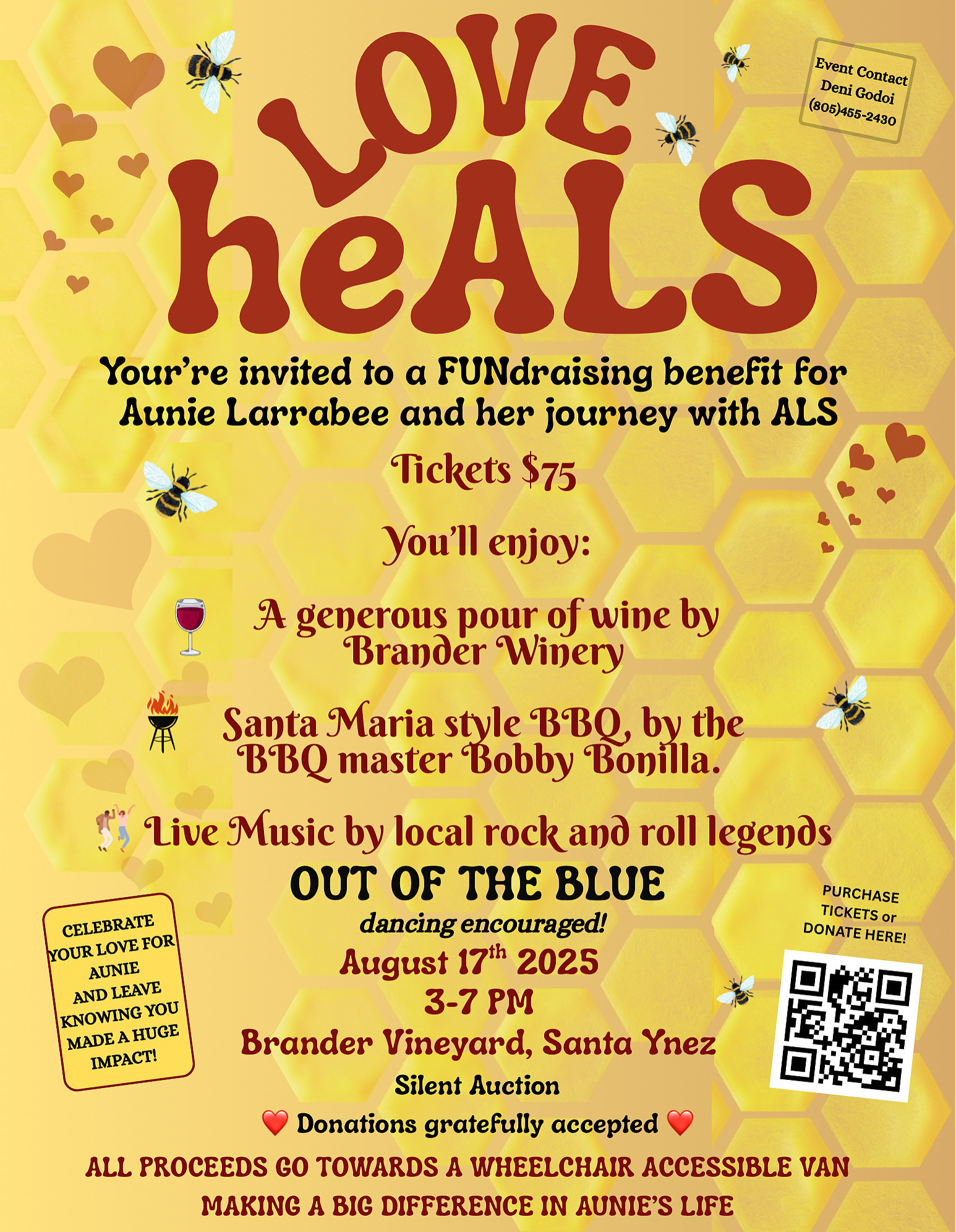 There will be a FUNdraising benefit for her at Brander Vineyard on August 17th. Live music with local rock legends OUT OF THE BLUE, Brander vineyard wine and Classic Santa Maria Style BBQ. You can purchase tickets here, just click BUY TICKETS link.Celebrate your love for Aunie and leave knowing you made a huge impact!If you cannot make it, please consider a donation, or even a monthly donation. Silent auction donations are gratefully accepted.