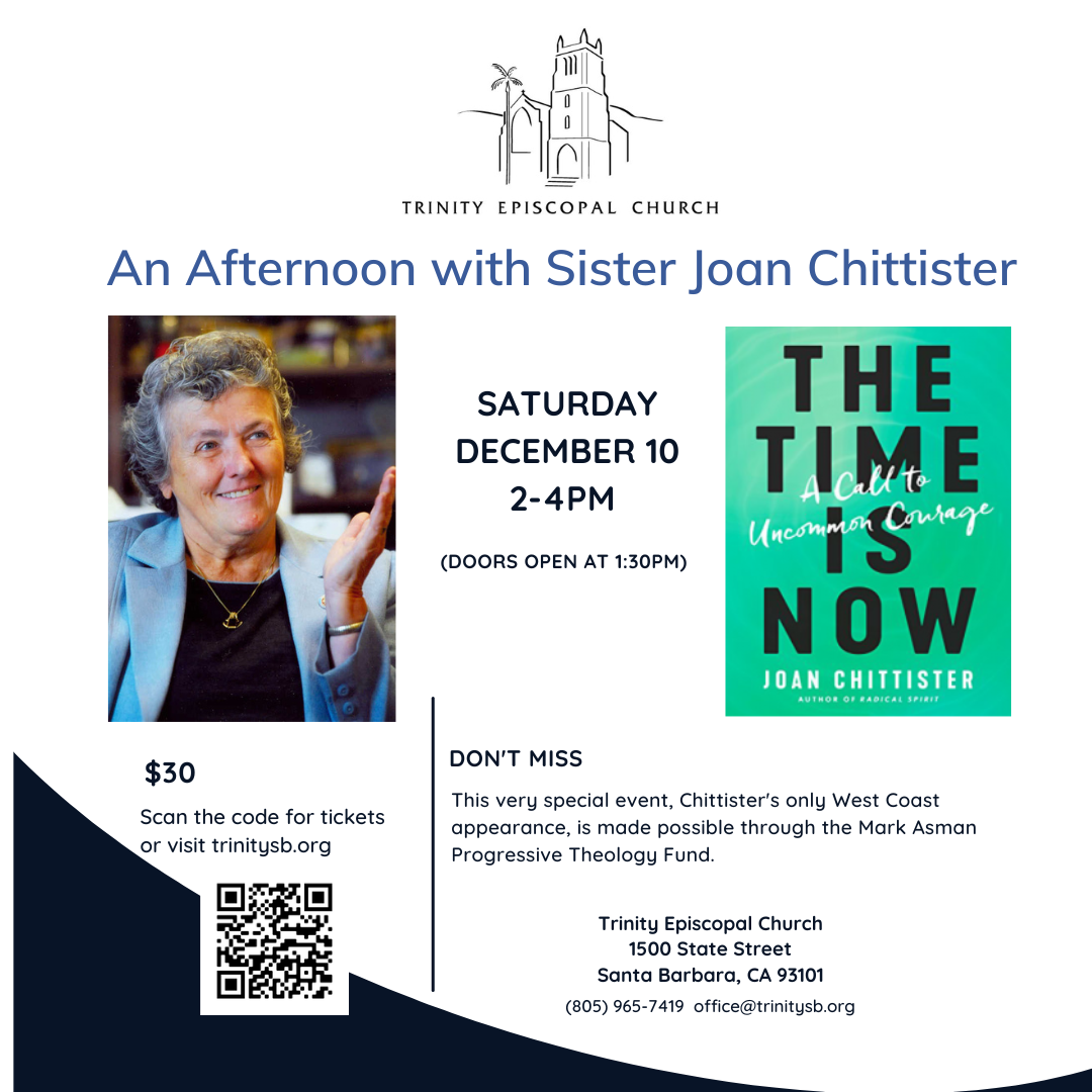 World-renowned spiritual and social leader, author, and Benedictine nun, Sister Joan Chittister, will be speaking at Trinity Episcopal Church in Santa Barbara, drawing on the themes in her book, The Time is Now: A Call to Uncommon Courage. Pairing scriptural insights with stirring narratives of the truth-tellers that came before us, Joan Chittister offers a compelling vision to combat complacency and to propel all of us toward creating a world of justice, freedom, peace, and empowerment.