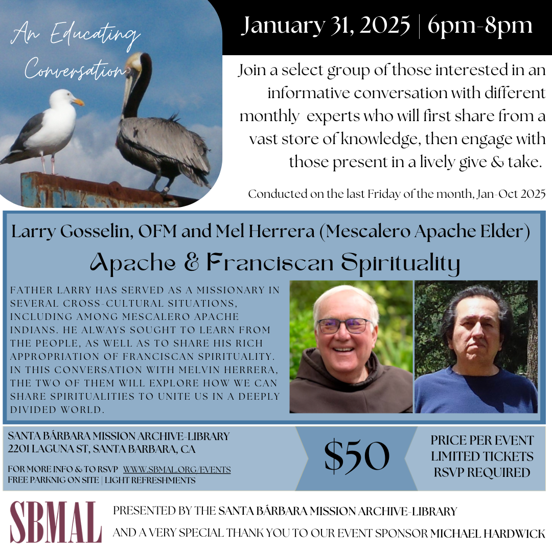 Our first of 2025 will be on Friday January 31st from 6-8pm featuring Larry Gosselin, OFM and Mel Herrera (Mescalero Apache Elder) who will be focusing on Apache & Franciscan Spirituality.