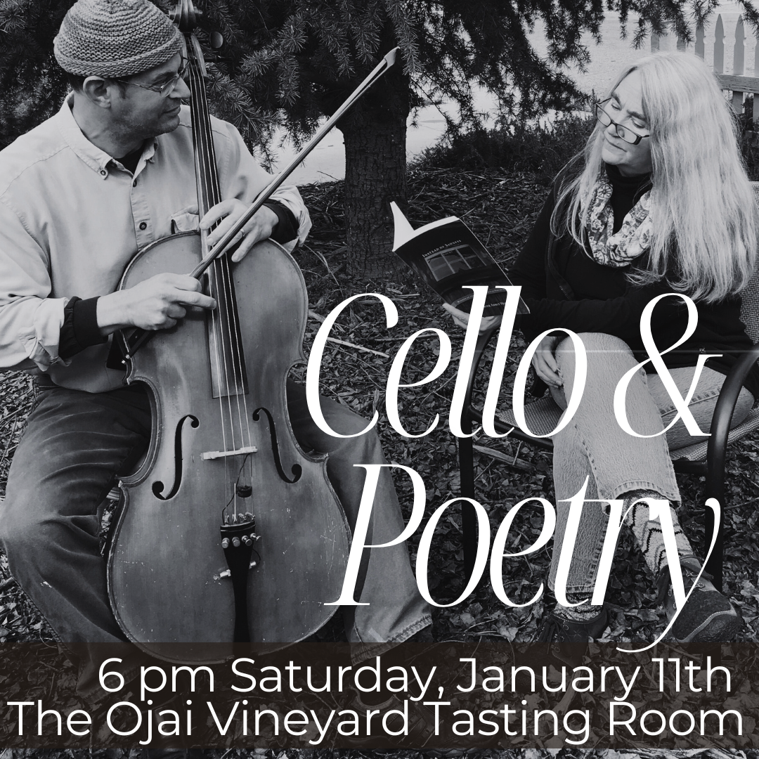 Come down from the holidays–or extend them!–with poems and cello at the Ojai Vineyard Tasting Room, 109 S. Montgomery St, Ojai, Jan. 11, 6 pm. Catherine Abbey Hodges will read poems from her new collection, Empty Me Full (Gunpowder Press 2024), and Rob Hodges will improvise on cello. Wine will be available for purchase, as will copies of Empty Me Full.