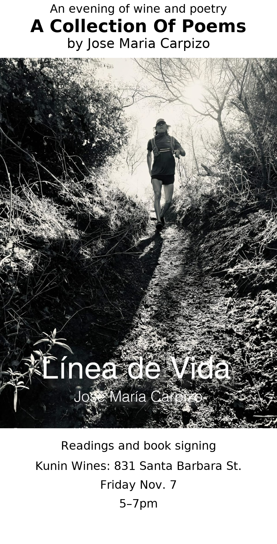 Enjoy a glass of wine and join Jose Maria Carpizo as he will read from and sign copies of, Línea de Vida, a Collection of Poems.