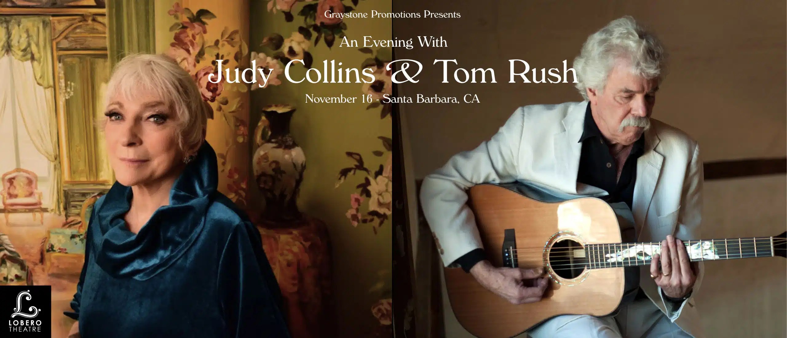 Graystone Promotions presents An Evening with Judy Collins & Tom Rush on Sunday, November 16, 2025 at 7 PM.