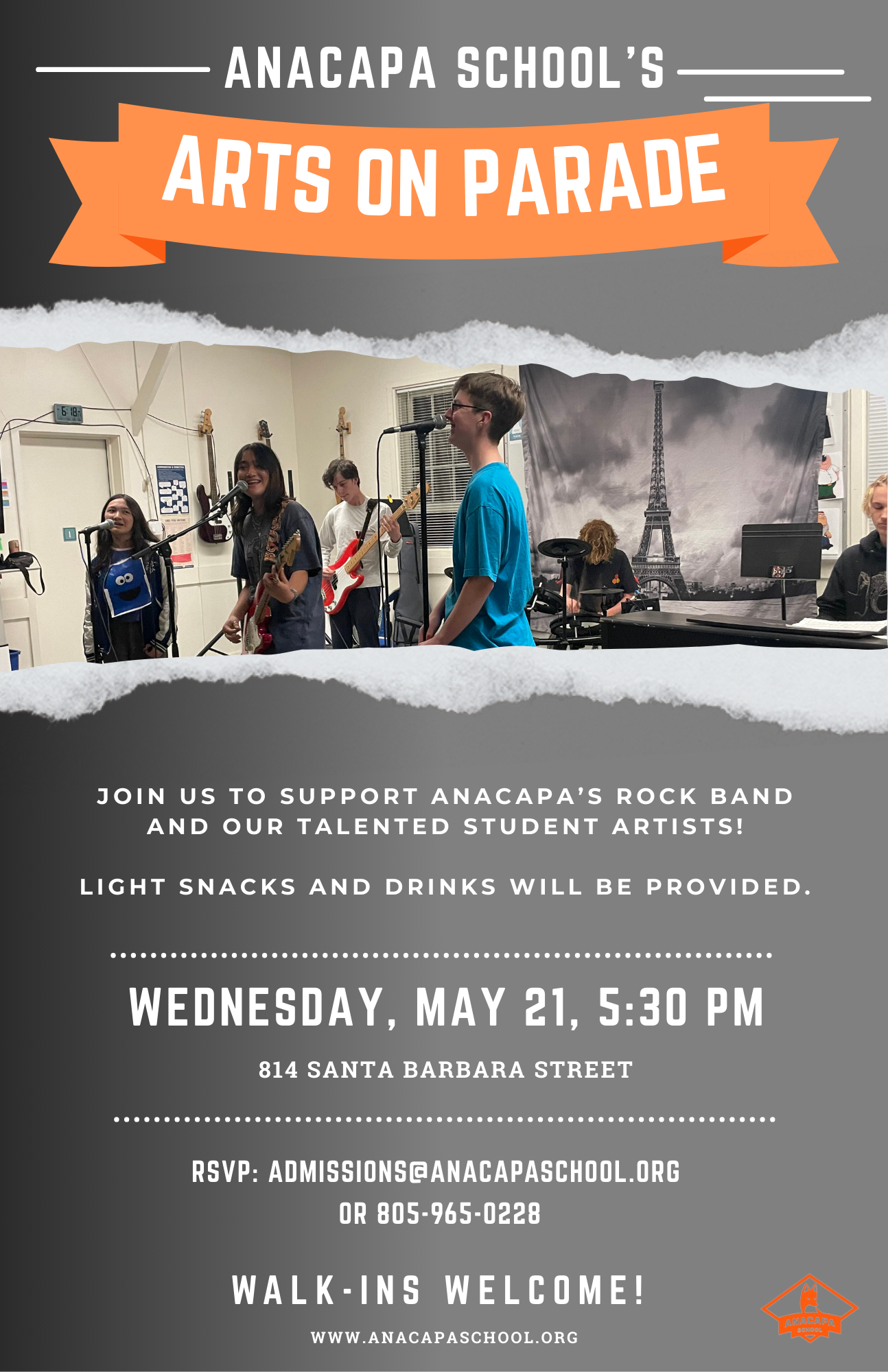 You are invited to Anacapa School’s Arts on Parade, a special evening showcasing our talented student artists, scientists, engineers, and rock band! This is a wonderful opportunity to experience Anacapa’s vibrant arts community and connect with our faculty, students, and parents. RSVP: admissions@anacapaschool.org or Walk-ins welcome!!