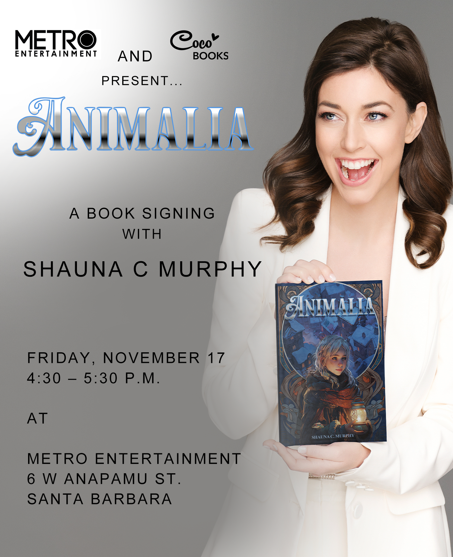 Metro Entertainment and Coco Studios present… Animalia! A special book signing and time with author Shauna C. Murphy at Metro Entertainment in downtown Santa Barbara on November 17 from 4:30 p.m. to 5:30 p.m. It will be a celebration of community, fan culture, and fantasy! Swing by to have your books signed and pick up exclusive merchandise in honor of Animalia.