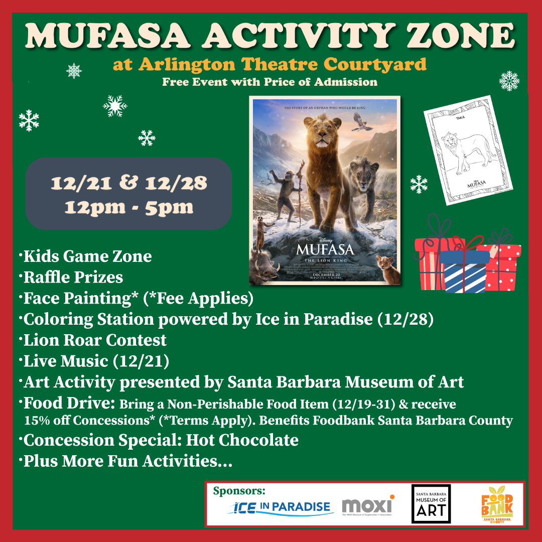 The Arlington theatre is converting its Arlington Theatre Courtyard into a fun family Mufasa themed activity zone and invites the community to come out to experience the highly anticipated movie MUFASA: THE LION KING on the big screen. Guests can get more information by visiting the www.MetroTheatres.com or www.ArlingtonTheatreSB.com.