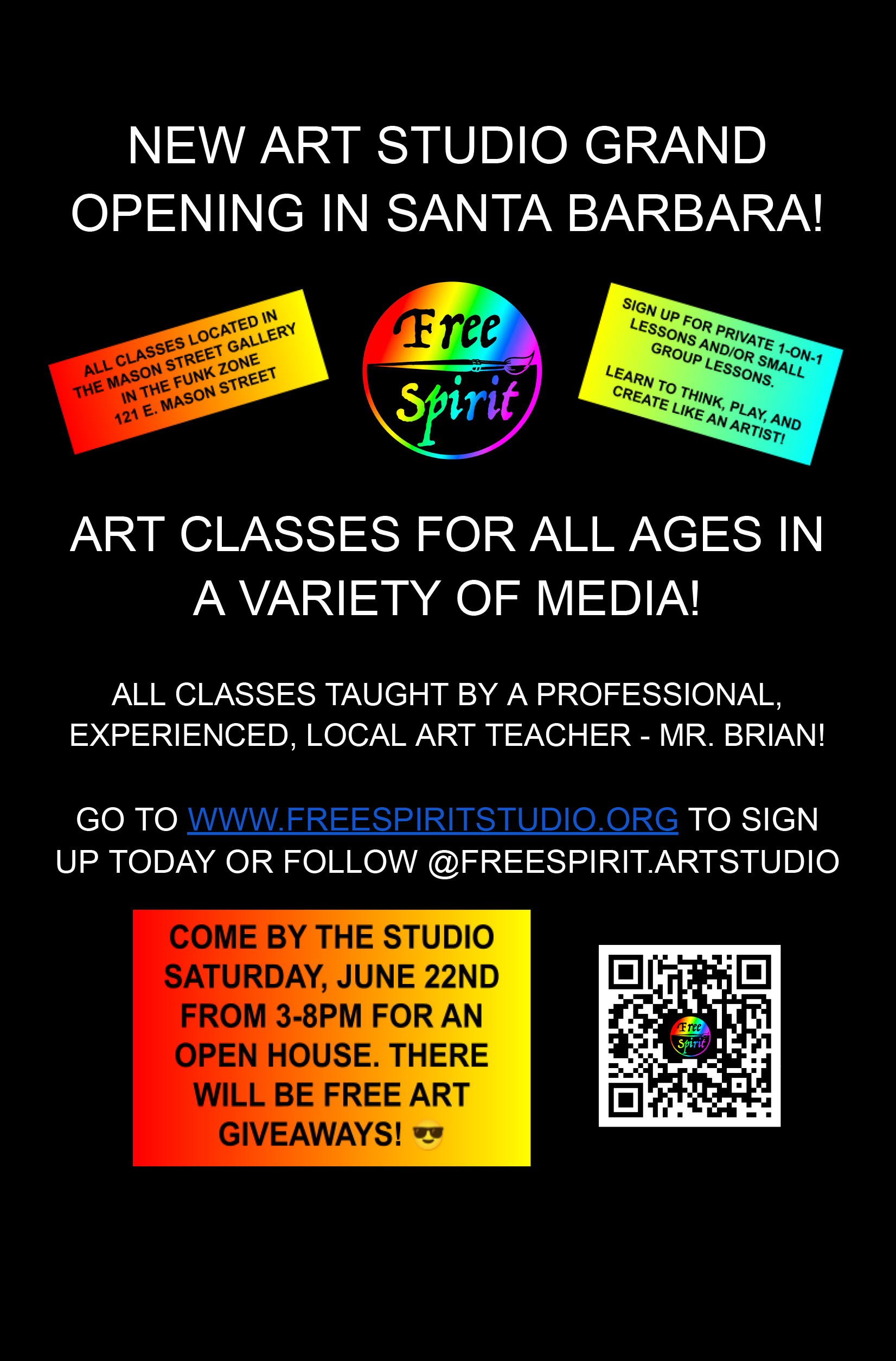 Free Spirit is a new art studio that offers private 1-on-1 and small group art lessons to students of all ages in a wide variety of media. Located in the Mason Street Gallery (Funk Zone), Free Spirit classes are taught by a professional, experienced, and local artist and art teacher “Mr. Brian”. On Saturday June 22nd, from 3-8pm, Free Spirit will have an open house and allow the public to come check out the space and sign up for classes on the spot. There will be free art giveaways for those who come. Classes are now open for registration at www.freespiritstudio.org