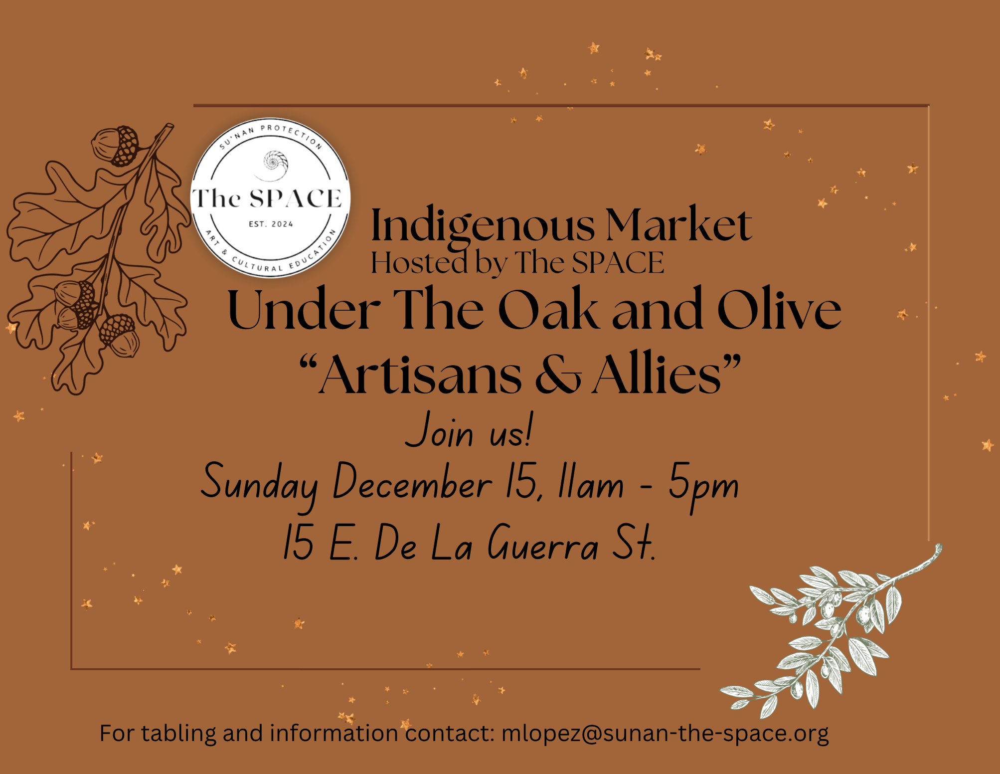 Santa Barbara — This Winter Solstice, The SPACE invites the community to celebrate art, culture, and the season at the Artists & Allies Indigenous Market. This first seasonal market happens on Sunday, December 15, from 11:00 am to 5:00 pm under the Oak and Olive. Join us in the 15 E De La Guerra (Casa de la Guerra courtyard), featuring a selection of handmade works of art, goods and jewelry from talented Indigenous artists and shared information from local allies.