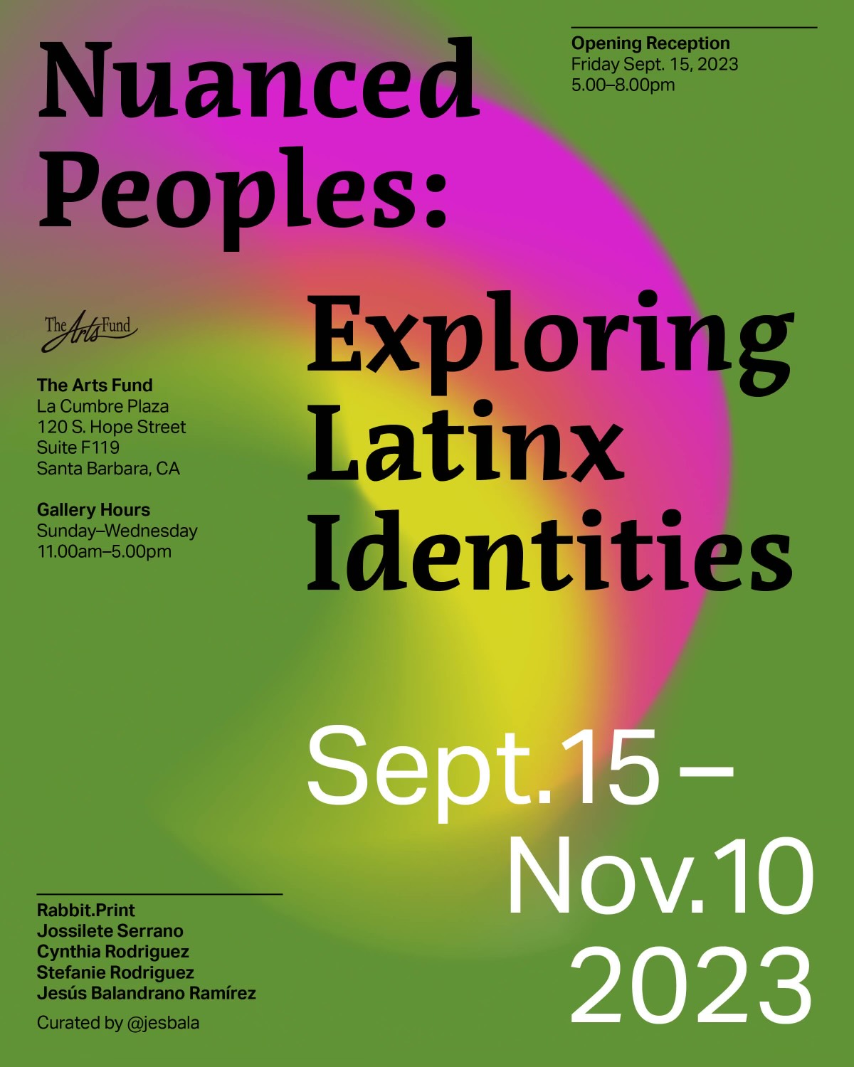 Nuanced Peoples: Exploring Latinx Identities with artworks by Cynthia Rodriguez, Jossilete Serrano, Rabbit.Print, Stefanie Rodriguez, and Jesús Balandrano Ramírez (curator). Santa Barbara’s vibrant Latinx cultures are on display from September 15th through November 10th at the Arts Fund Gallery located in the La Cumbre Plaza 120 S. Hope Street, Suite F119. We welcome you to the world of Nuanced Peoples.