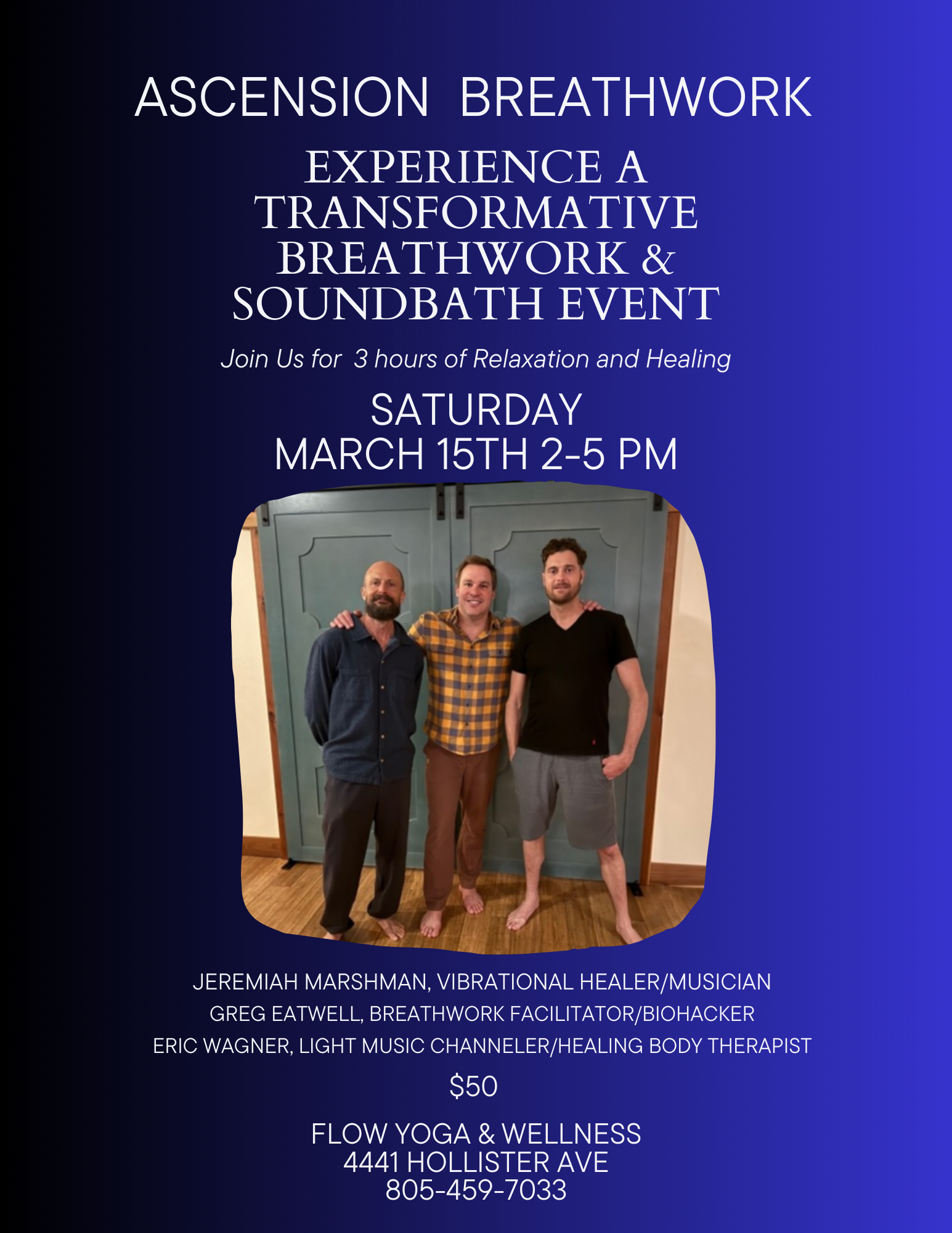 Come experience a Breathwork and meditation lead by Greg Eatwell with Sound Experience by Jeremiah & Eric.