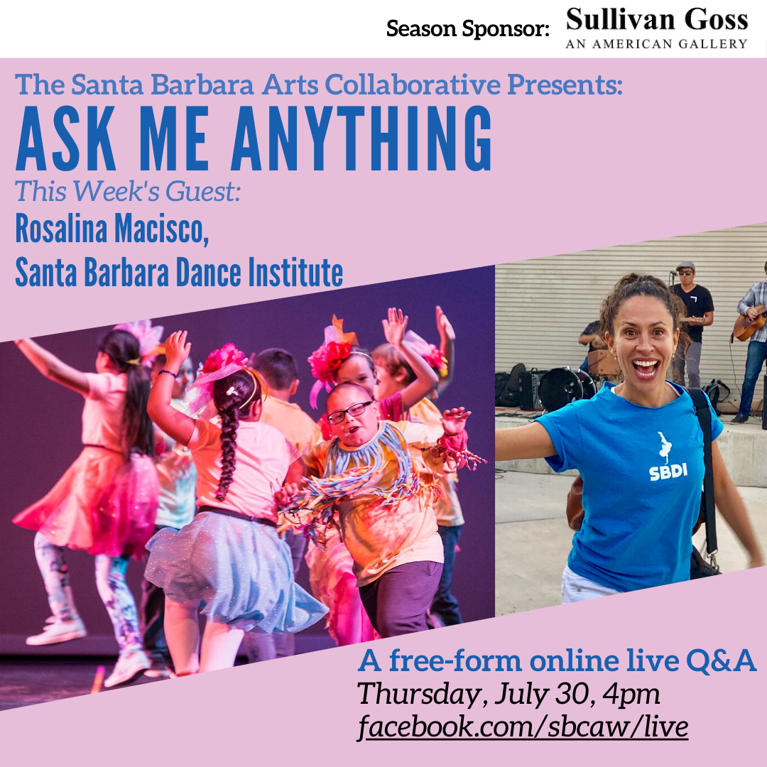 Ask Me Anything continues this Thursday with an interview with Rosalina Macisco, the Founder of The Santa Barbara Dance Institute (SBDI). Rosalina Macisco is a Choreographer, Dance Educator, Stage Director, and Founder of SBDI. Ms. Macisco is the daughter of a Puerto Rican mother and Italian American father. She is bilingual, first-generation Latinx and New York native who has performed professionally for 15+ years, appearing in Off-Broadway plays, regional theater productions, and national television commercials. She has also toured with many musical productions throughout Europe.