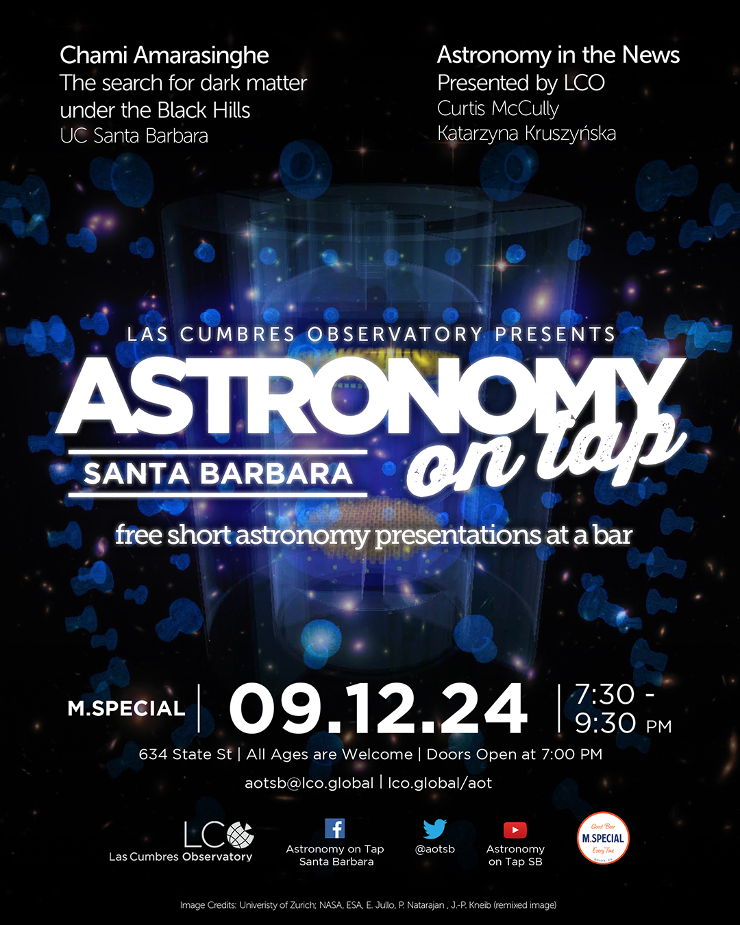 The show will feature Chami Amarasinghe of UCSB presenting “The search for dark matter under the Black Hills” and Curtis McCully and Katarzyna Kruszyńska with a fun overview of Astronomy in the News.