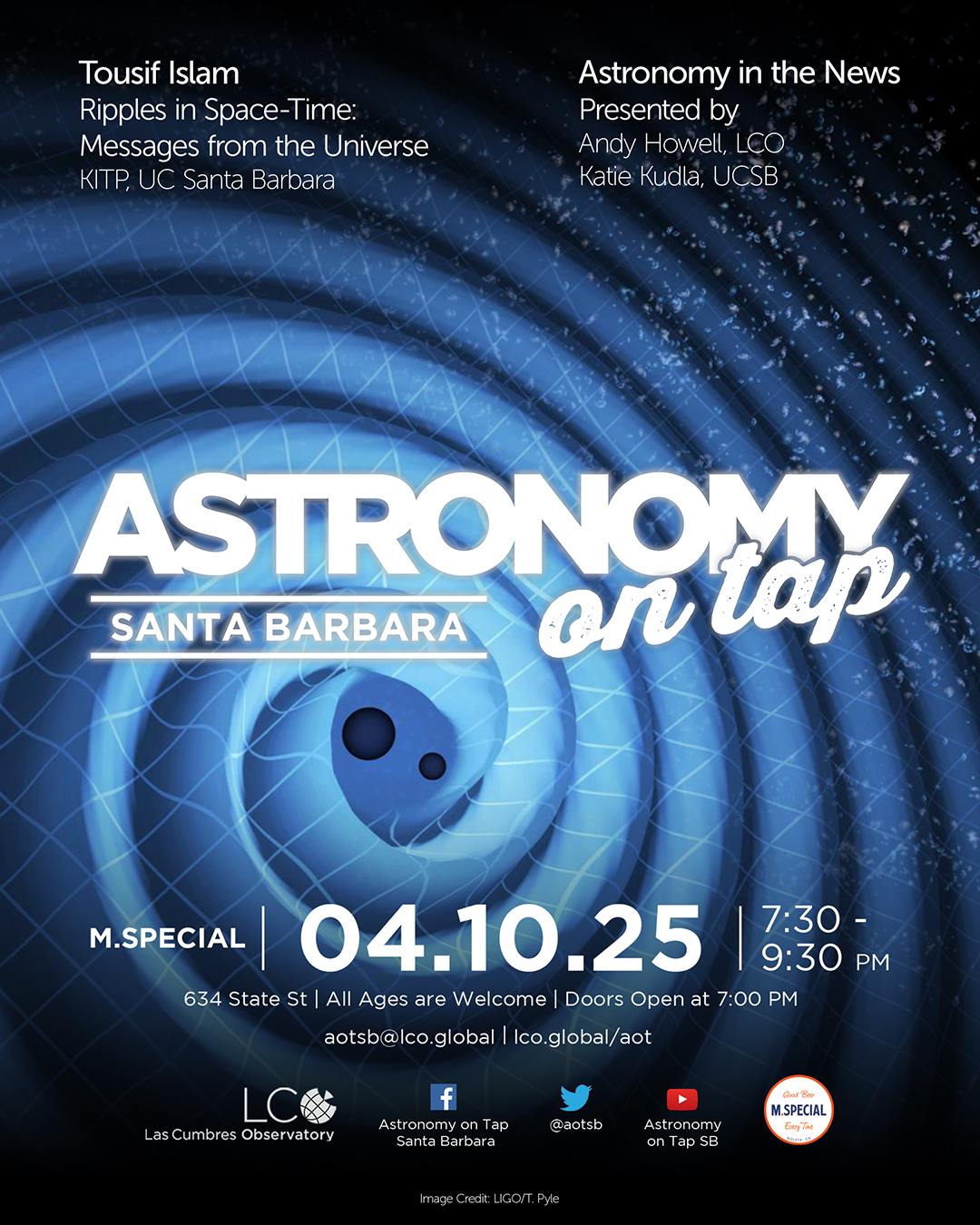 The show will feature Dr. Tousif Islam of UCSB presenting “Ripples in Space-Time: Messages from the Universe” and Andy Howell and Katie Kudla with a fun overview of Astronomy in the News.