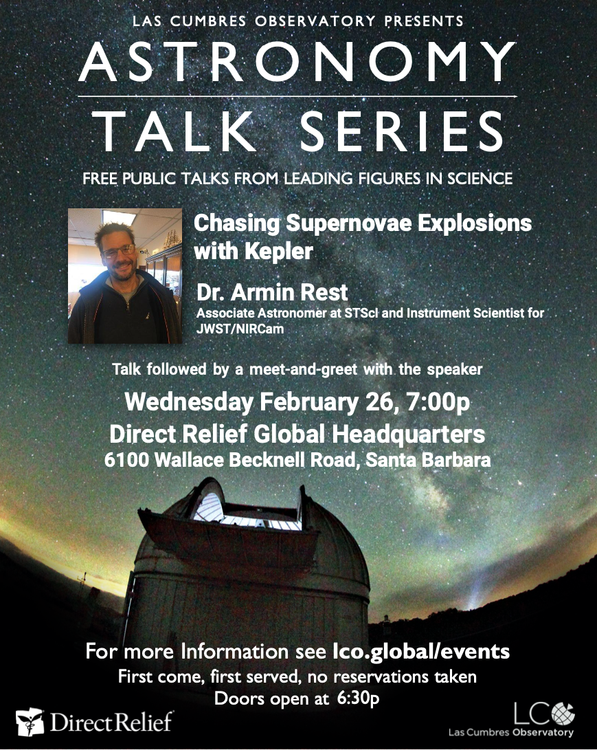 Dr. Armin Rest will speak on “Chasing Supernovae Explosions with Kepler”. Talk followed by a meet-and-greet with the speaker.