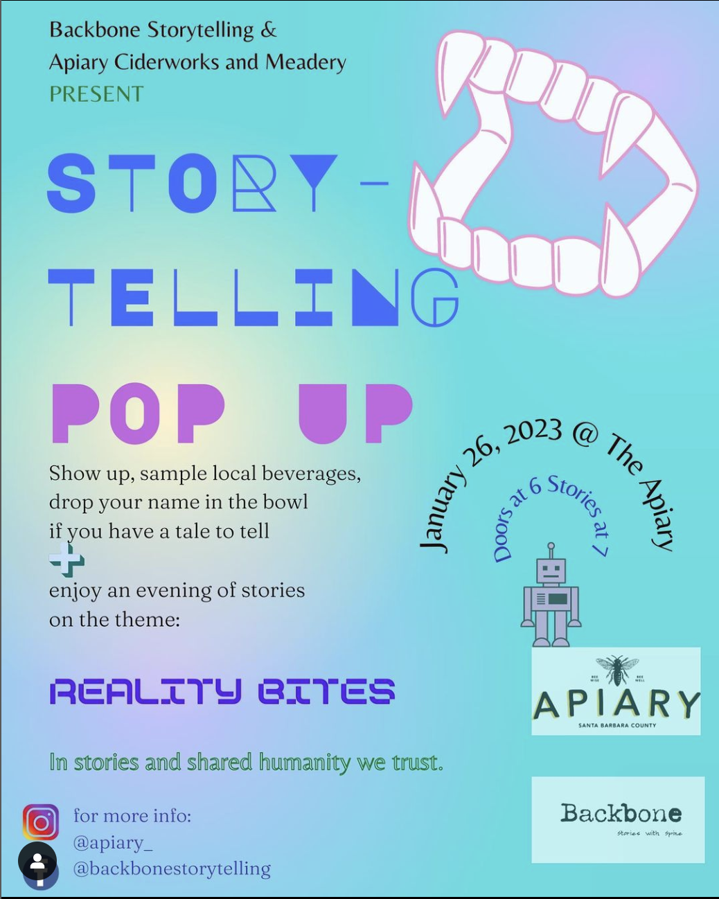 Personal stories told LIVE on the theme: Reality Bites. Participants drop their names in a bowl and tell a true story (10 minutes or less) through words, movement, or music. Food truck onsite, and both alcoholic/nonalcoholic beverages for purchase. Emceed by Jenna Tico. All ages!