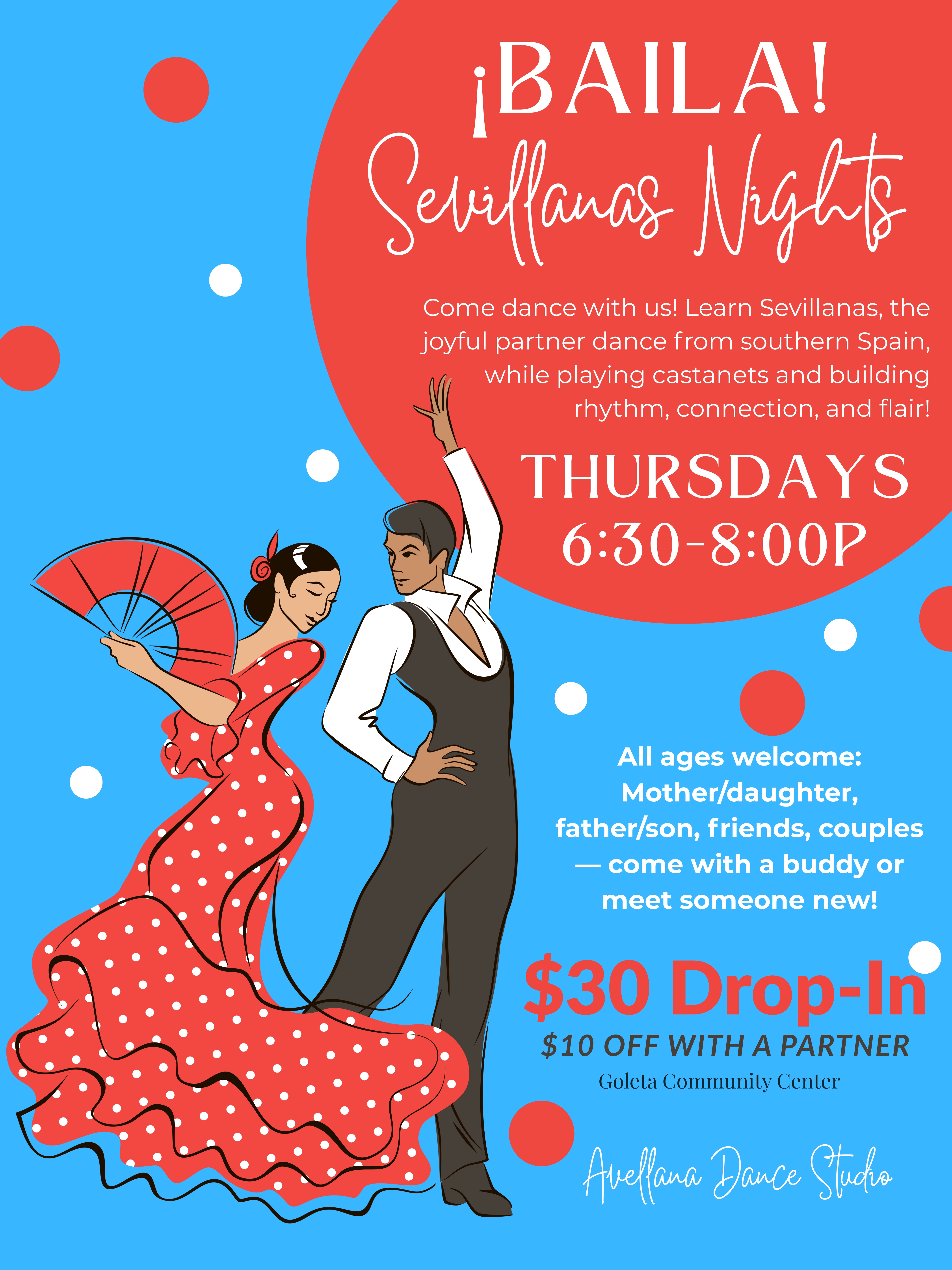 Join us for a joyful evening of Sevillanas, the vibrant partner dance from southern Spain — now with castanets! Perfect for all ages and combinations: mother-daughter, father-son, friends, couples. No partner required!