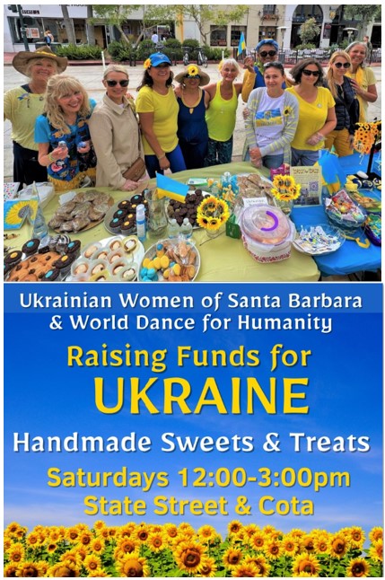 Every Saturday, 12:00-3:00pm, the Ukrainian women of Santa Barbara are offering “Handmade Treats & Sweets” and World Dance for Humanity is offering Ukrainian dances – at State St. and Cota.