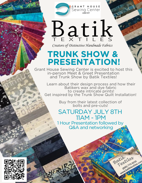 Grant House Sewing Center is excited to host this in-person Meet & Greet Presentation and Trunk Show by Batik Textiles!
