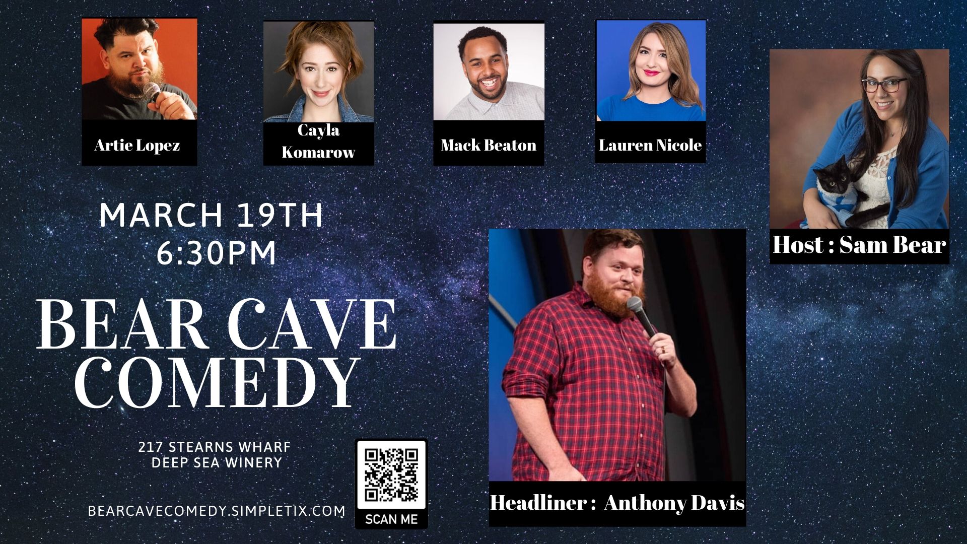 Gather your squad for the inaugural Thursday night showcase of the Bear Cave Comedy show, as we turn Deep Sea Winery into the speakeasy on the water. Join our talented comedy troupe of Lauren Nicole, Artie Lopez, Cayla Komarow, Mack Beaton, Sam Bear (Host) and Anthony Davis as your headliner. Our comics have been featured at The Ice House, Flappers, Laugh Factory, Levity Live, Wildcat, S0hO, Velvet Jones, SB Comedy Hideaway and many more!