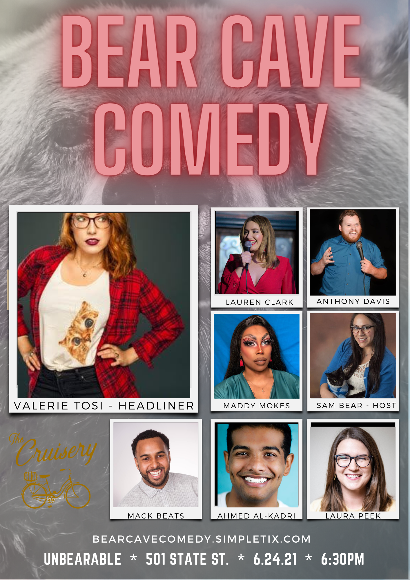 Gather your squad for the Bear Cave Comedy show, as we turn Unbearable (attached to The Cruisery) into the speakeasy off State Street. Join our talented comedy troupe of Sam Bear (Host), Mack Beats, Maddy Mokes, Lauren Clark, Laura Peek, Ahmed Al Kadri, Anthony Davis, with headliner Valerie Tosi.