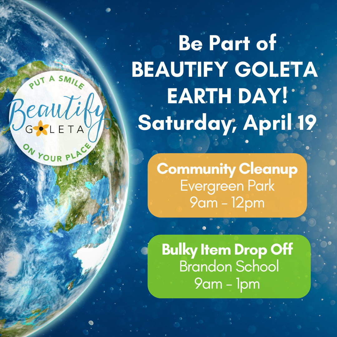 The City of Goleta is excited to announce its third annual Beautify Goleta Earth Day event happening this year on Saturday, April 19, 2025, from 9:00 a.m. to 12:00 p.m. at Evergreen Park (Evergreen Drive at Hillview Drive) 🌱