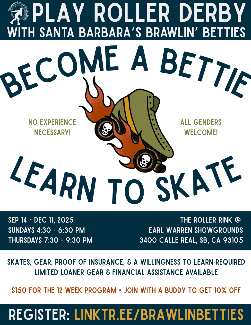 $150 per person, due at the end of the first practice (digital payment methods, cash, or check payable to “Mission City Roller Derby”)