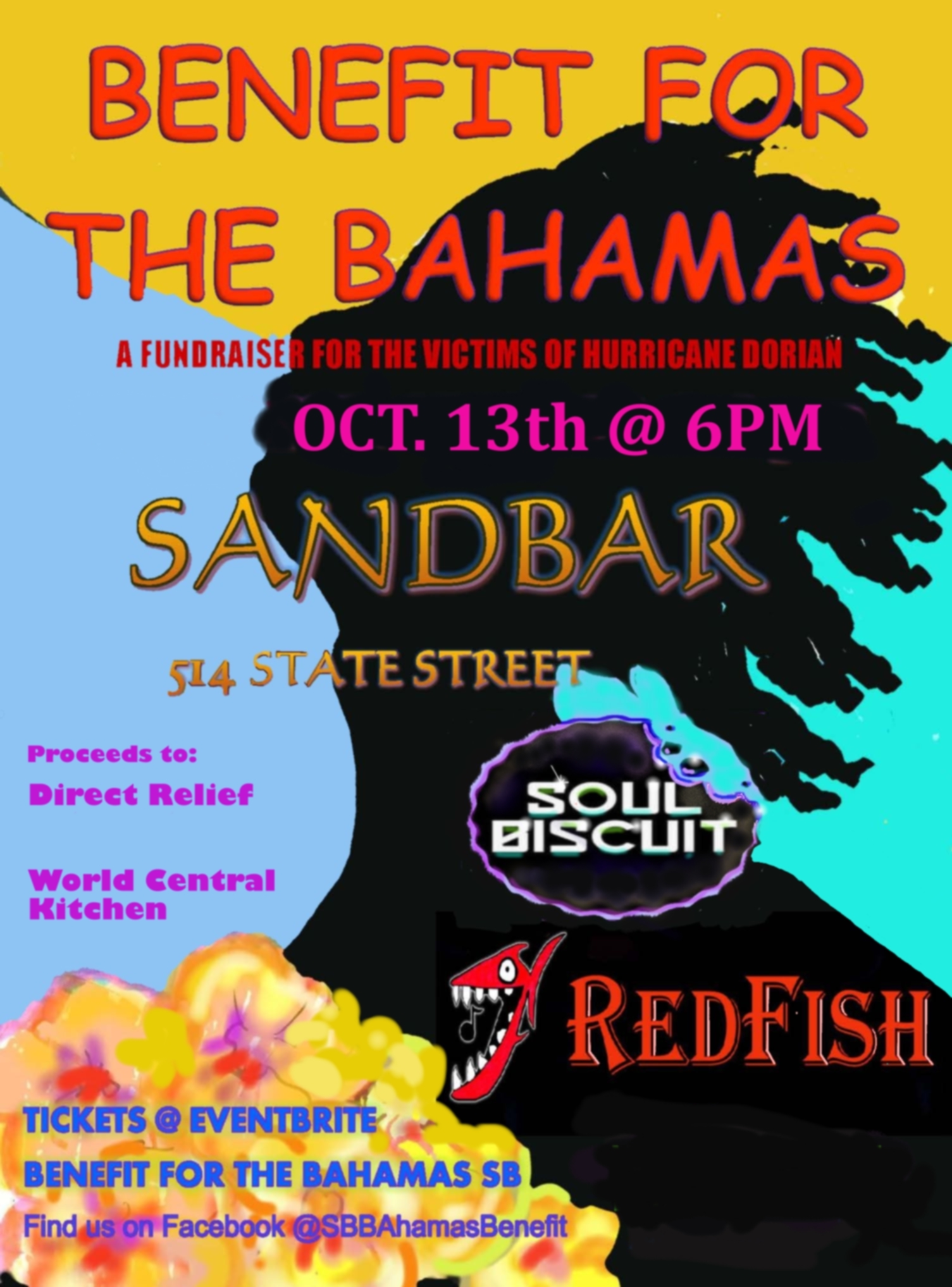Locals4locals is sponsoring a fundraiser to benefit the people devastated by hurricane Dorian in the Northern Bahama islands. The Benefit for the Bahamas. Music will be provided by two awesome local bands  – Soul Biscuit and Redfish. Sandbar is providing drink and appetizer specials, there will be a silent auction and door prizes provided by local businesses including Yoga Soup, Brewhouse, Massage Envy, and the Santa Barbara Zoo.  All proceeds will go directly to Direct Relief International and World Central Kitchen to support their ground operations in the Bahamas.