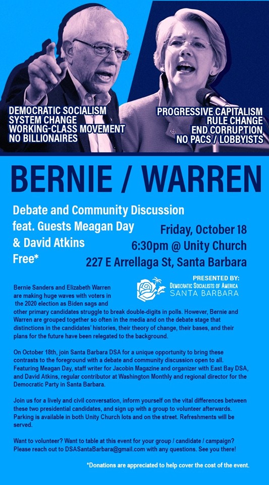 Join Santa Barbara DSA for a unique opportunity to bring these contrasts to the foreground with a debate and community discussion open to all. Featuring Meagan Day, staff writer for Jacobin Magazine and organizer with East Bay DSA, and David Atkins, a regular contributor at Washington Monthly and regional director for the Democratic Party in Santa Barbara.