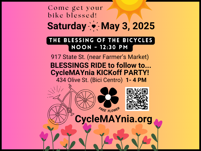 When: Saturday, May 3, 2025 from Noon to 12:30 pm blessing / Blessings ride 1:00 to 2:00 pm then to Move Santa Barbara County’s Bici Centro for the CycleMAYnia Kick-off Mixer until 4pm.