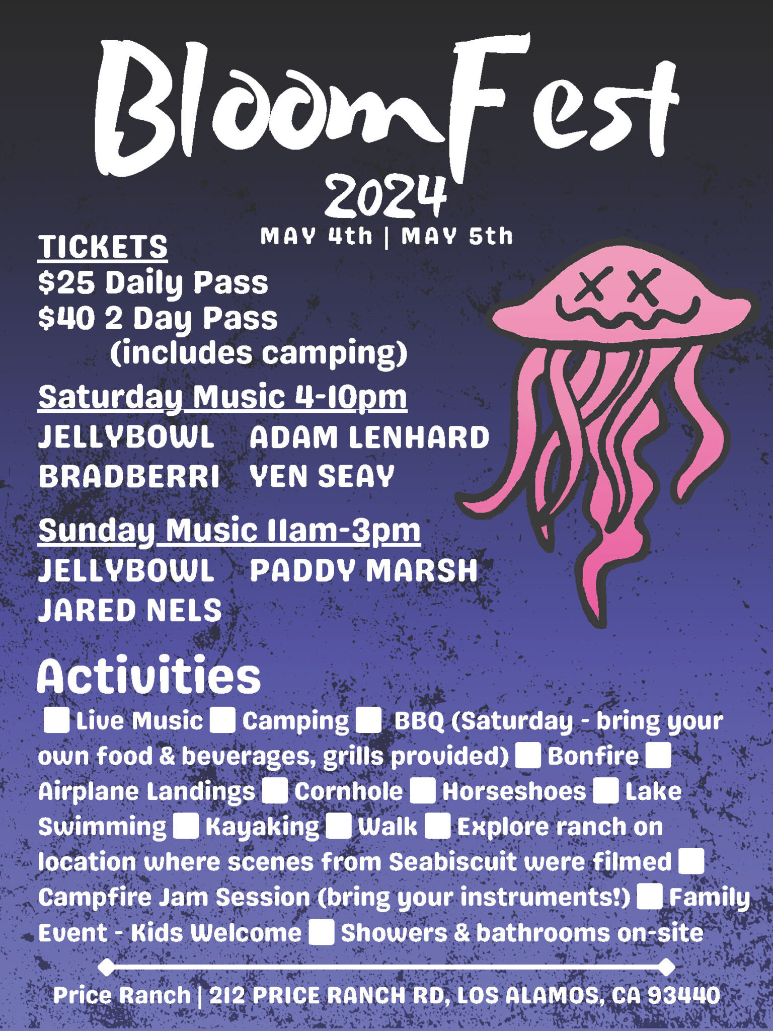 Live Music Camping BBQ (Saturday – bring your own food & beverages, grills provided), Bonfire Airplane Landings, Cornhole, Horseshoes, Lake Swimming, Kayaking, Walk, Explore ranch on location where scenes from Seabiscuit were filmed, Campfire Jam Session (bring your instruments!), Family Event, Kids Welcome,, Showers & bathrooms on-site.